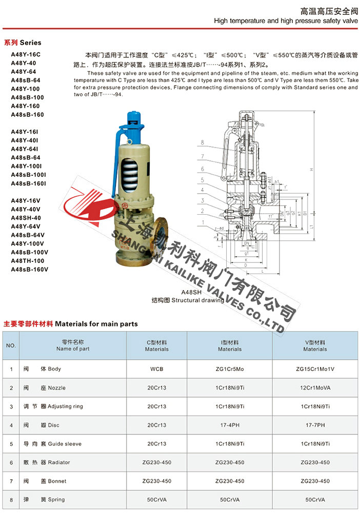 聲明:【A44Y,A48Y蒸汽安全閥】規(guī)格型號、結構尺寸由上海凱利科閥門有限公司提供,如何選擇適用的A44Y,A48Y蒸汽安全閥產(chǎn)品,使之在工藝控制中安全可靠、經(jīng)濟適用,可致電我司銷售部門及技術部門,我們將在最短的時間內為您解答!
